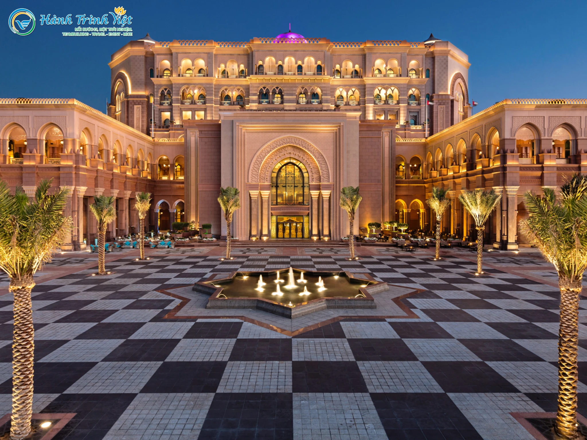 - Emirates Palace. Quý khách thưởng thức cà phê và bánh ngọt phủ vàng tại đây và tận hưởng cảm giác vương giả trong tòa lâu đài tráng lệ của vương quốc Abu Dhabi (Chi phí tự túc). Tham quan và check in bên ngoài một trong những khách sạn xa hoa nhất thế giới.