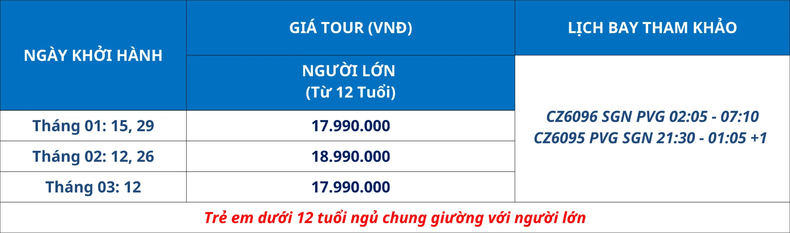 Khám phá trọn vẹn vẻ đẹp Giang Nam với hành trình Tour Thượng Hải – Hàng Châu – Tô Châu – Ô Trấn – Vô Tích 5N4Đ. Quý khách sẽ được du ngoạn Tây Hồ thơ mộng, lạc bước giữa phố cổ Ô Trấn – ‘Venice của Châu Á’, thăm phim trường Tam Quốc tại Vô Tích và cảm nhận nhịp sống hiện đại bậc nhất tại Bến Thượng Hải. Tour trọn gói, cam kết khởi hành đúng lịch, visa đoàn thủ tục đơn giản và mức giá tốt nhất 2026.