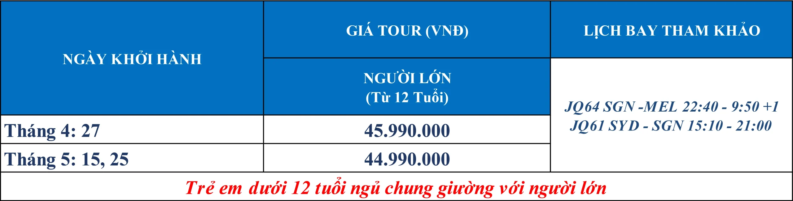Trải nghiệm mùa đẹp nhất của nước Úc với hành trình Tour Úc 7N6Đ trọn gói, khởi hành từ TP.HCM. Chuyến đi bắt đầu tại Melbourne – thành phố đáng sống nhất thế giới với nét đẹp cổ kính, trải nghiệm tàu hơi nước Puffing Billy và thị trấn đào vàng Ballarat. Hành trình khép lại đầy cảm xúc tại Sydney sôi động, nơi Quý khách check-in Nhà hát Con Sò và du thuyền trên vịnh Darling Harbour tuyệt đẹp
